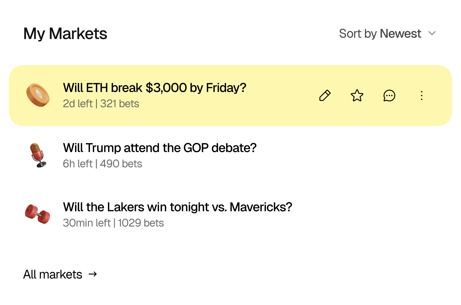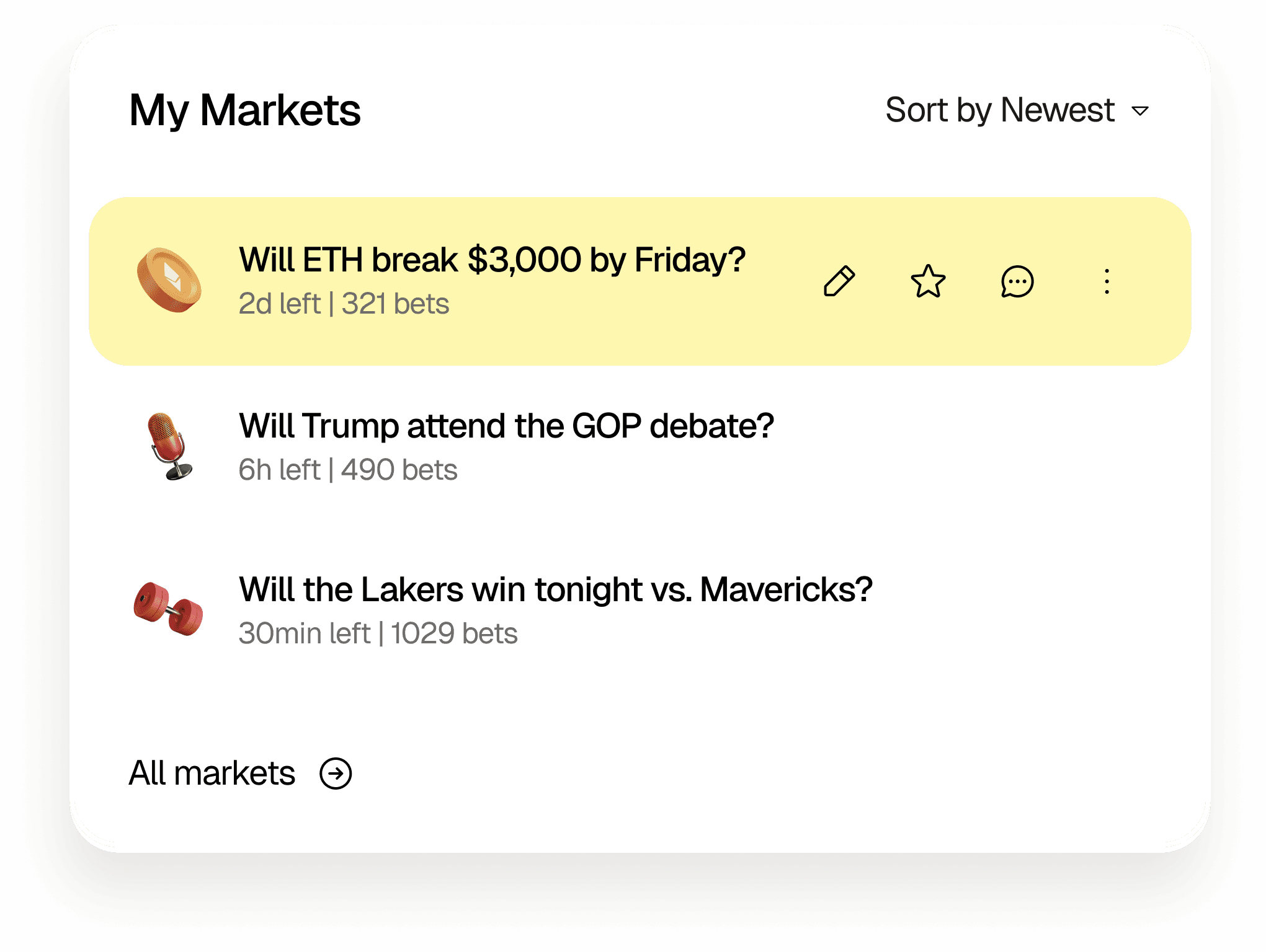 Launch prediction markets that live inside your community. It’s free to use, easy to get started, and you earn every time someone places a bet.